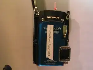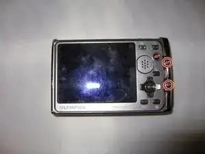 Отвёрткой Phillips 00 отвинтите винт 3,9 мм, расположенный рядом с чёрной декоративной панелью с надписью «Olympus».