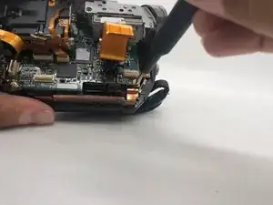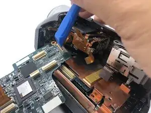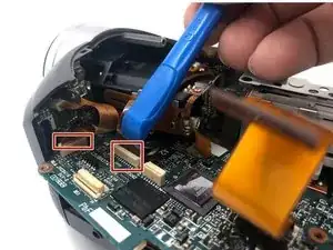 Отсоедините ленточный кабель с помощью пластикового инструмента для вскрытия, чтобы можно было снять левую часть корпуса камеры.