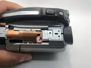 Используйте отвертку Phillips #0, чтобы выкрутить два винта 5 мм на основании батарейного отсека камеры.