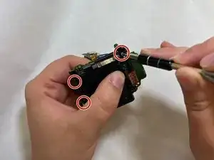 В верхней части платы находятся три припаянные точки, которые необходимо распаять, чтобы отсоединить заднюю часть блока аккумулятора от материнской платы.
