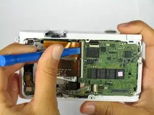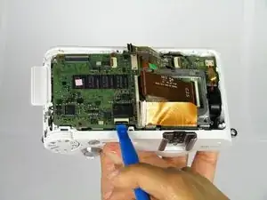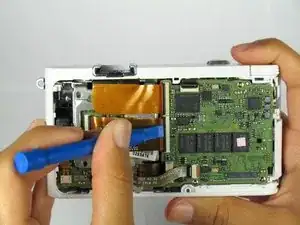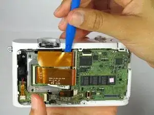 Не отделяйте заднюю панель полностью от камеры. Внизу слева под кнопками находится шлейф. Шлейф удерживает заднюю панель на камере. Не засовывайте инструмент в эту область, иначе шлейф порвётся.