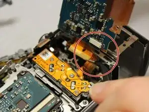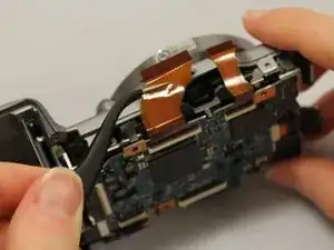 Поднимите белую фиксирующую защёлку и с помощью пинцета извлеките последний тонкий ленточный кабель.