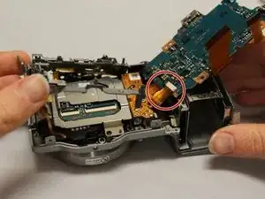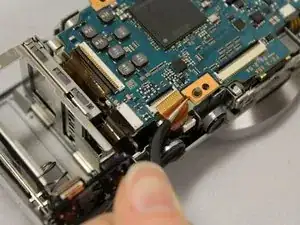Поднимите серую пластиковую деталь камеры, окружающую материнскую плату.