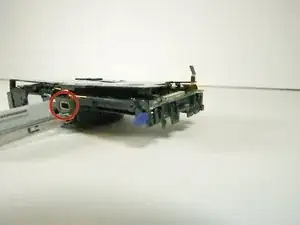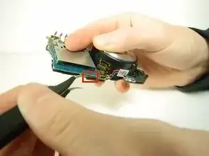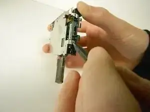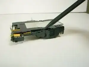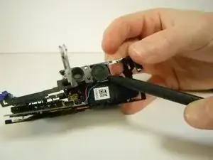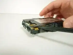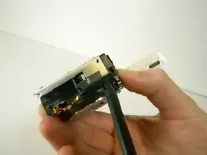 Переверните камеру так, чтобы снизу была обращена к вам. Затем используйте лопатку, чтобы отцепить пластиковую защёлку справа, рядом с местом, где была плата управления ЖК.