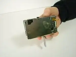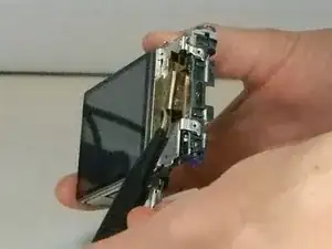 С помощью пинцета снимите шлейф, соединяющий ЖК-экран с камерой, потянув за часть, завернутую снизу.