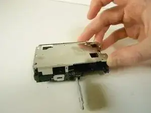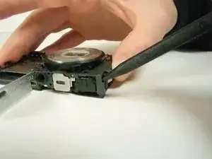Открутите винт 0,45 см, расположенный в верхнем правом углу на задней стороне камеры. После снятия винта используйте лопатку и отстегните деталь, удерживающую верхнюю часть с левой верхней стороны на передней части камеры. Она должна легко сняться.