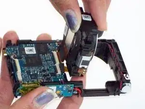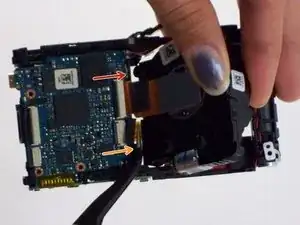 Осторожно потяните за маленький ленточный кабель (соединяющий корпус объектива с материнской платой) пинцетом.