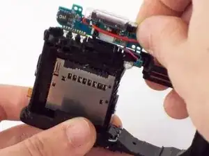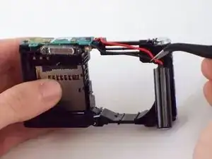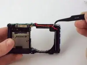 Используйте пинцет. Выведите толстый красный кабель, прикреплённый к дополнительной плате, из его посадочного места в корпусе камеры.