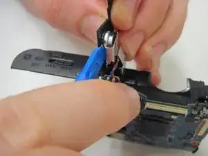 После снятия ЖК-дисплея используйте отвертку J00, чтобы извлечь два серебряных винта длиной 4 мм. После извлечения винтов отодвиньте деталь пальцами.