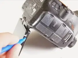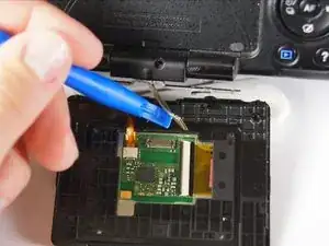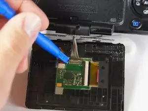 Используйте пластиковый инструмент для разборки, чтобы отключить серебристые провода от схемы экрана и полностью удалить экран из камеры.