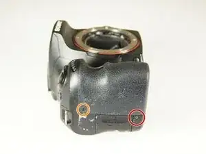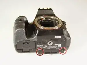 Удалите два винта Phillips #00 размером 4.0 мм с правой стороны камеры, которые расположены на верхней правой стороне и под крышкой порта "Remote".
