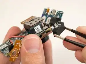 С помощью пинцета потяните и снимите черную распорку, расположенную в верхней части внутренней поверхности корпуса камеры, и отложите деталь в сторону.