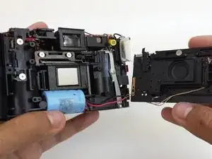Передняя лицевая панель соединена с корпусом камеры двумя тонкими проводами. Аккуратно снимите панель и полностью отделите её от корпуса камеры.