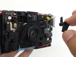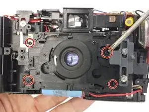 Используйте отвёртку с тонким стержнем и открутите два указанных винта внутри отсека для плёнки.