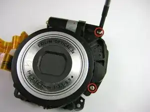Теперь, когда объектив полностью открыт, удалите два винта с крестообразной головкой (4,34 мм) на передней части объектива.