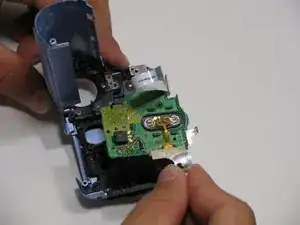 Найдите синий пластиковый инструмент для открывания, затем снимите оба круглых регулятора записи/воспроизведения и записи/питания, поддев их и отщёлкнув с корпуса видеокамеры.