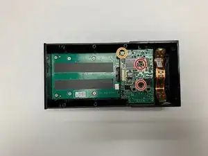 Удалите два чёрных винта Phillips #00 длиной 5 мм, фиксирующих плату камеры в устройстве.
