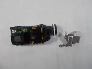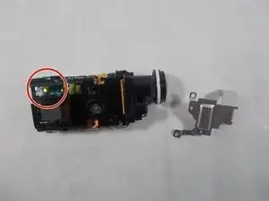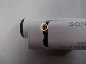 Теперь удалите винт прямо над ЖК-дисплеем, тонкий прямоугольник возле задней части блока объектива. Это ослабит чёрный пластиковый кожух над внутренней электроникой.