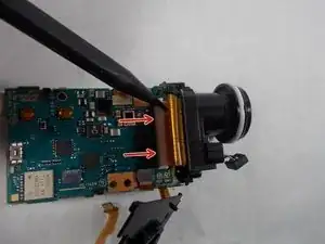 Это откроет толстый жёлто-золотистый шлейф спереди блока рядом с объективом. Аккуратно потяните этот шлейф в сторону передней части. Шлейф не должен оказывать сильного сопротивления при правильном выполнении.