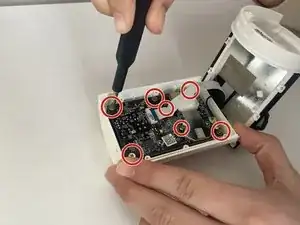 Выверните семь винтов 4 мм, соединяющих плату с корпусом камеры, с помощью отвертки Phillips #00.