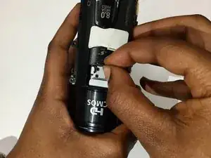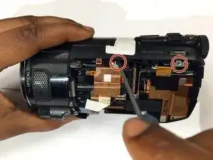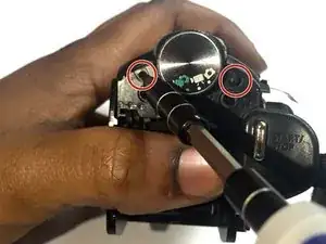 Снимите два винта Phillips 3x4 мм, расположенные под крышками, маркированными AV и DCIN. Эти крышки находятся при виде на заднюю часть камеры.