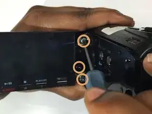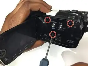 Переверните видеокамеру вверх дном и снимите три винта Phillips 3x4 мм, выделенные на схеме.