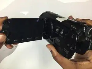 Поверните видеокамеру логотипом Canon к себе и снимите пластмассовый кожух с задней стороны объектива. Под этим кожухом находится шарнир с винтом.
