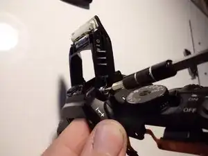 Удалите винт 7 мм JIS #000 на шарнире вспышки.