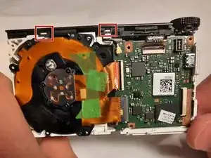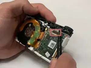 На стороне с экраном снимите плату кнопок (обведена красным) с камеры, отсоединив разъём, расположенный в правом верхнем углу стороны с экраном.