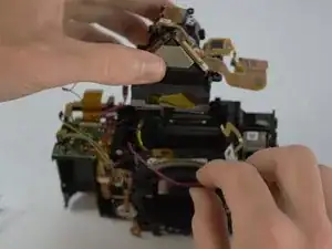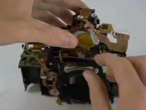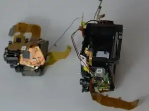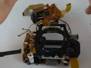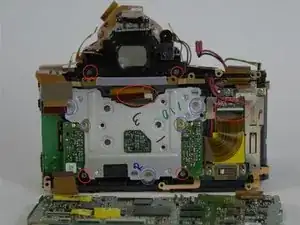 Необходимо снять несколько винтов, ленточных кабелей и нижнюю часть корпуса камеры, как показано на фотографии.