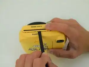 Используйте лопатку, чтобы снять защитную планку слота для плёнки на верхней части камеры.