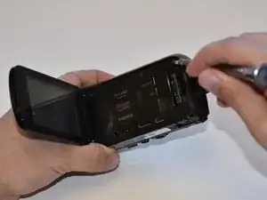 Используйте отвертку Phillips #000, чтобы удалить три винта Phillips #000 длиной 3 мм с внешней оболочки вокруг кнопки записи, затем снимите её и маленький микрочип.