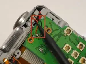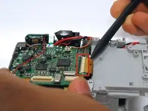 Используйте лопатку (spudger), чтобы отщелкнуть красный и чёрный провода из-под корпуса кнопки спуска и диска настроек.