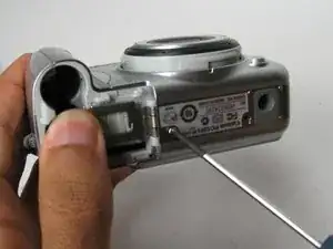 Переверните камеру и выкрутите винт Phillips 4.5 мм, чтобы отделить кнопку спуска и диск настроек от остальной части камеры.