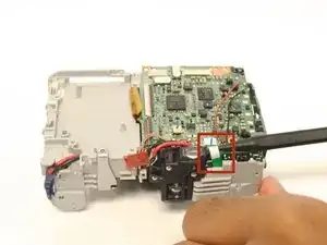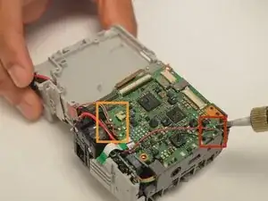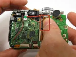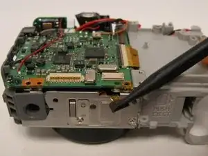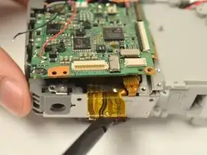 После отключения всех шлейфов аккуратно приподнимите материнскую плату, чтобы получить доступ к шлейфу, соединяющему материнскую плату с объективом.