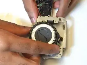 Отвинтите два винта с крестообразной шлицей длиной 3,5 мм с металлической рамки объектива с помощью отвертки.