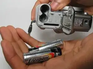 На нижней части камеры используйте большой палец и подвиньте фиксатор батареи вверх, чтобы открыть отсек. Крышка отсека аккумуляторов должна отскочить, и батареи выскользнут.