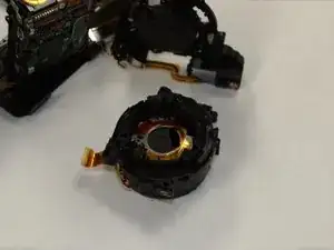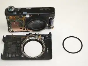 Чтобы удалить два других разъёма, необходимо снять переднюю часть корпуса. Медленно подденьте по краям пластиковым инструментом, чтобы освободить корпус. С внутренней стороны камеры выпадет кольцо объектива; отложите его в сторону.
