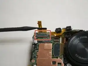 С помощью пластикового лопаточки медленно извлеките шлейф через отверстие, показанное на изображении. Первый из трёх разъёмов логики, соединяющих дисплей с камерой, теперь отключён.