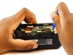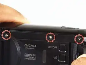 Используя отвёртку, найдите и удалите четыре винта Phillips #00 длиной 6 мм, соединяющие боковую панель с нижней частью видеокамеры.