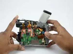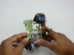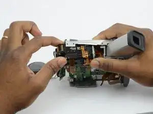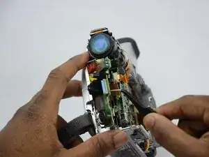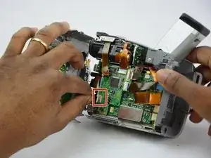 Вытяните белый провод из его разъёма, чтобы зелёная плата можно было полностью снять с основного корпуса видеокамеры.