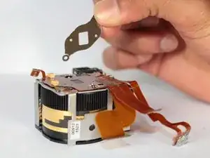 Отверткой Phillips #00 снимите два винта 4.4 мм, удерживающие металлический кронштейн на объективе.