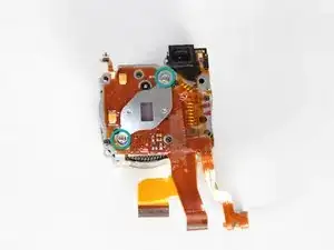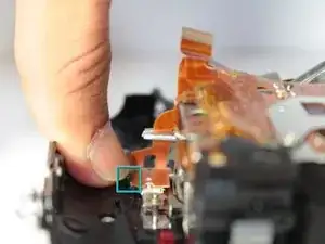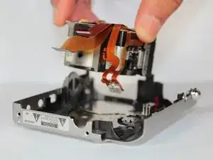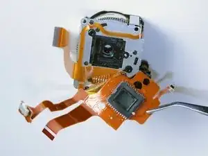 Пинцетом аккуратно потяните за маленькую оранжевую шлейфовую ленту в верхнем левом углу рядом со вспышкой, чтобы вынуть квадратную вставку.