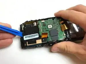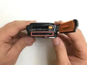 Аккуратно раскройте камеру, обратив внимание на две оранжевые ленты с одной стороны, соединяющие материнскую плату с экраном.