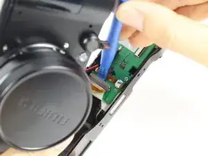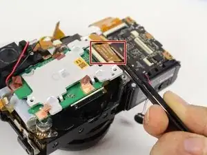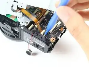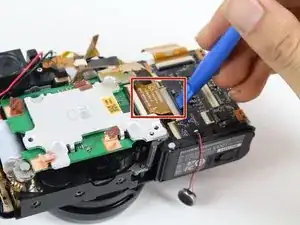 Используйте пластиковый монтажный инструмент, чтобы поддеть ленточный кабель, расположенный справа вверху от зелёной платы сенсора.