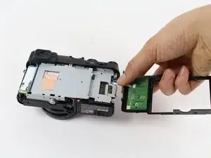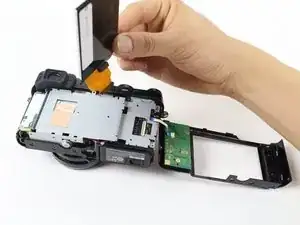 Сборка заднего ЖК-экрана и блока кнопок теперь должна откинуться вверх и вправо, обнажив шлейфы ЖК-экрана и кнопок.