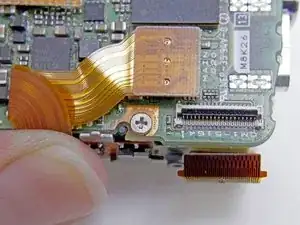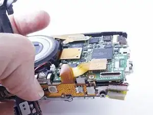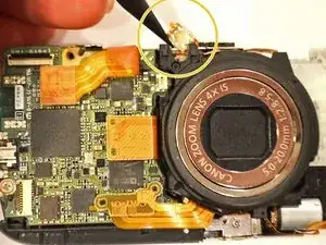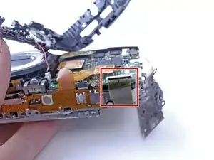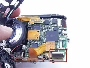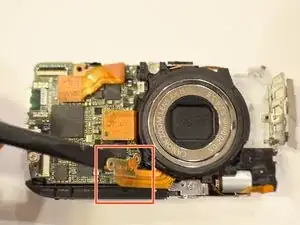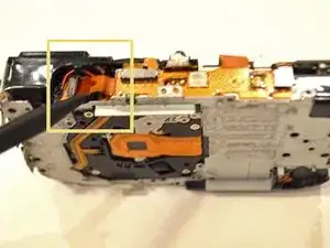 Сверху камеры отсоедините ленточный кабель блока вспышки позади лампы вспышки с помощью острия лопатки или маленьких пинцетов.
