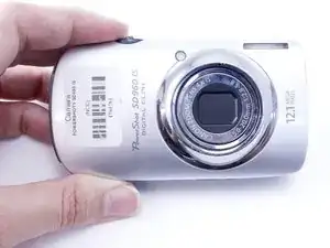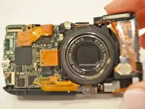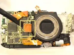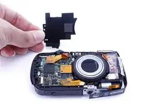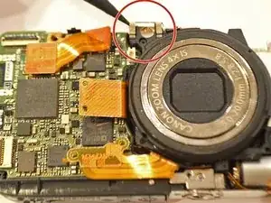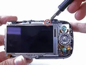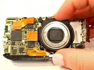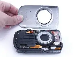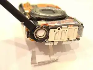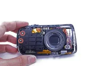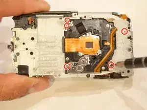 Отверткой Philips 000 выкрутите пять винтов (длиной 2,7 мм) из серебристой пластины, на которой закреплен объектив, на задней стороне (со стороны экрана) камеры.