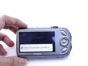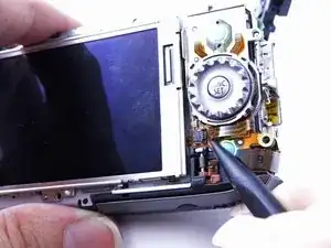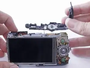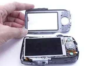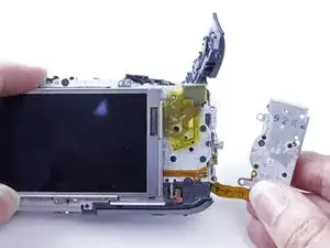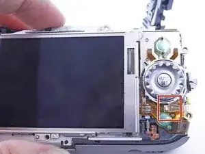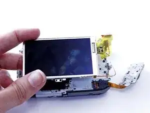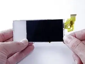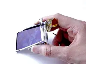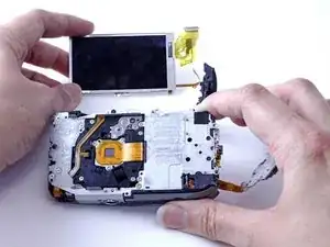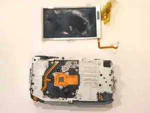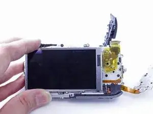 ЖК-экран снят и может быть заменён или отложен, чтобы получить доступ к другим компонентам камеры.