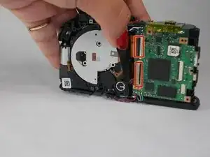 Отключите два шлейфа для объектива. Для этого нужно сдвинуть замок вниз. После ослабления замка шлейф должен легко вытянуться.